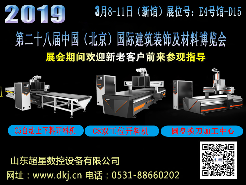 您好,超星數(shù)控將于2019年3.8-11日在中國國際展覽中心,舉辦的二十八屆中國(北京)國際建筑裝飾及材料博覽會。本次展會的主題是:數(shù)控標(biāo)準(zhǔn)型板式家具生產(chǎn)線。展會參展機(jī)器,超星新款黑色系,有木工加工中心、四工序開料機(jī)、絲杠換刀機(jī)、C5雙切排鉆開料機(jī)、雙工位排鉆加工中心、四工序開料機(jī)、實(shí)木側(cè)銑機(jī)、側(cè)孔機(jī)等。